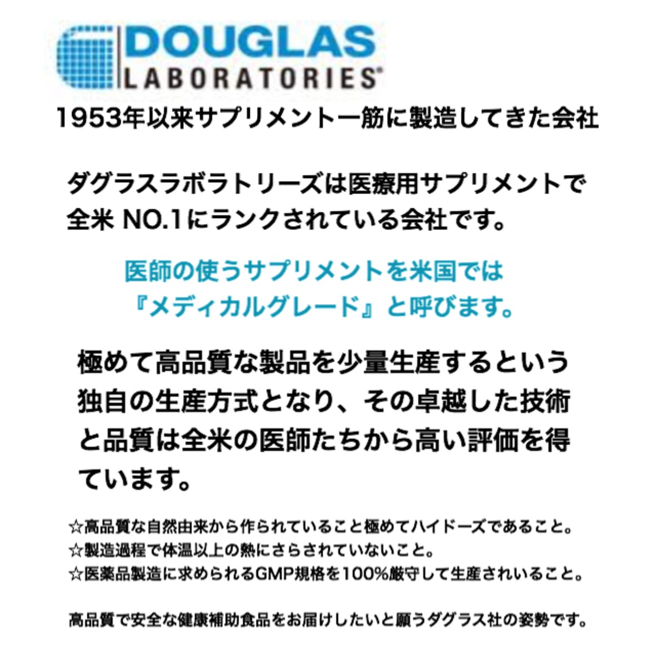 使用される全ての成分が自然由来であること、高い熱をかけずに打錠する「コールドプロセスメソッド」を厳密に守ること、有機溶剤を一切使用しない安全な成分抽出方法を行うこと、そして、一般的に添加物と言われる、製造に必要な素材も、全て自然由来のものを使用すること、というダグラス製品共通の遺伝子によって製造されています。